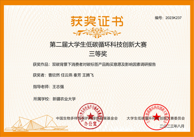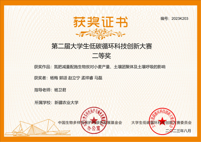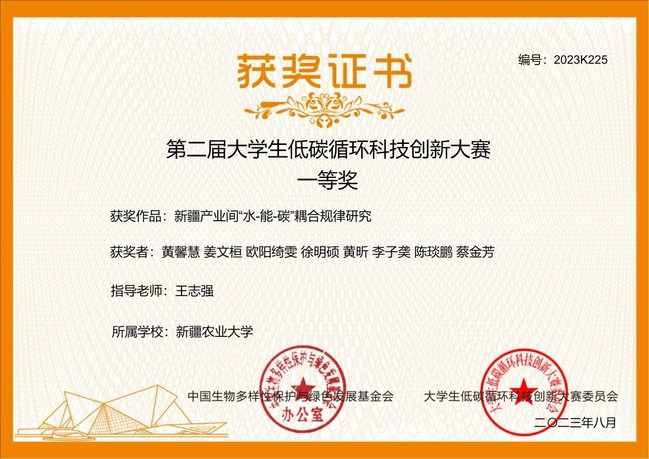 近日,第二届大学生低碳循环科技创新大赛决赛落幕,新疆农业大学研究生在大赛中斩获一、二、三等奖好成绩。公共管理学院(法学院)王志强副教授指导的研究生黄馨慧团队的作品《新疆产业间“水-能-碳”耦合规律研究》获一等奖,农学院杨卫君副教授指导的研究生杨梅团队的作品《氮肥减量配施生物炭对小麦产量、土壤团聚体及土壤呼吸的影响》获二等奖,王志强副教授指导的研究生曹欣然团队的作品《双碳背景下消费者对碳标签产品购买意愿及影响因素调研报告》获三等奖。
