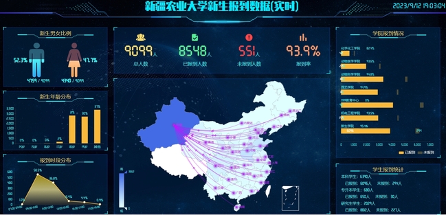 迎新数据大屏将“已报到”“报到率”“学院报到情况”等多个统计维度的全校新生报到数据通过多种形式进行展示,让迎新整体工作的数据呈现更加直观和立体,也为统筹和决策提供了可靠的支撑。