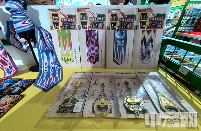 新疆农业大学文创旗舰店坐落在人流密集的校园图书馆一隅,十多平方米的店内,错落有致的展柜上摆放着各式各样的文创产品,除了有校园帆布包、扑克牌、明信片、笔记本等,还有艾德莱斯创意窄巾、民族乐器冰箱贴开瓶器等将新疆传统非遗技艺与潮流相结合的日常小物件,向进店的师生展示着属于新疆市井烟火中传承的手工艺魅力。