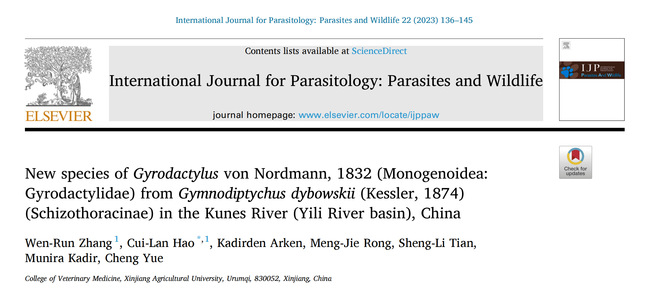 Abstract: Yili River system hosts a diverse fauna of fishes and parasites. Gymnodiptychus dybowskii is a rare and endangered aboriginal cold-water fish inhabit in the Yili river system, Our research identified a new species Gyrodactylus gymnodiptychi n. sp. isolated from G. dybowskii in the Kunes River (Yili River, China). Morphological comparisorrevealed identifiable differences between the new species and other parasites, including Gyrodactylus aksuensis.and Gyrodactylus tokobaevi, which are two known parasites living in G. dybowskii inhabit in the Aksu River westof Frunze (Kyrgyzstan), as well as Gyrodactylus montanus living in Shizothorax intermedius inhabited in theTadzhikistan or Uzbekistan. Especially, the dorsal bar of G. gymnodiptychi n. sp. was raised at both ends with ahollow, and its hamulus roots were curved inward. The BLASTN search of GenBank did not detect any other ITS1.5.8S-ITS2 rDNA sequences same as G. gymnodiptychi's. Using the Bayesian Information and Maximum Likelihood methods to analyze the ITS1-5.8S-ITS2 rDNA gene sequences, we constructed phylogenetic trees for G. gymnodiptychi n. sp. Accordingly, our morphological and molecular research indicated that G. gymnodiptychi n. sp. was not only a new species of parasites but also the first Gyrodactylus member identified in the Yili River in China.