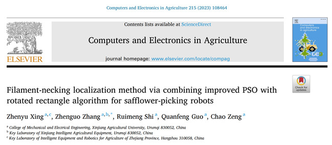 Abstract: Safflower is one of the most important specialty economic crops in the world. Safflower blossoms are harvested continuously for 3–5 times. Untimely picking can affect the opening of filaments in the next crop, resulting in reduced filament production and serious economic losses. However, the safflower images collected by picking robots were affected by lighting conditions or complex backgrounds. The existing segmentation algorithms have the problem of insufficient segmentation or over-segmentation, because of the small safflower size and localization area. Therefore, combining improved particle swarm optimization (PSO) with a rotated rectangle algorithm based on the filament-necking localization method for safflower-picking robots was proposed. The Rcomponent image in RGB color space was extracted as a preprocessing sample by combining the color features of safflower. The inertia weights in the PSO algorithm are improved to enhance the performance of the algorithm. An adaptive nonlinear function is introduced to search for the optimal threshold and initially segmented to obtain the binary image. Then, the barycenter and minimum outer rectangle of the contour were set up using the rotated rectangle algorithm based on the geometric features of the filaments. The circular region of interest (CirROI) of filament-necking is determined. The Zhang-Suen refinement algorithm was used for skeleton extraction to design an algorithm for localizing the picking point of safflower filaments. To test safflower images collected in complex environments, the results of average processing time were 0.14 s, and the average relative target area error rate was 19.33 %. Moreover, the localization accuracy of the picking point was 89.75 %. The filamentnecking localization method provides a theoretical basis and experimental data support for damage reduction and efficient harvesting of safflower filaments.