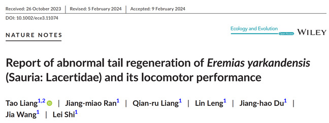 Abstract: Caudal autotomy is a phenomenon observed in many reptile taxa, and tail loss is a pivotal functional trait for reptiles, with potentially negative implications for organism fitness due to its influence on locomotion. Some lizard species can regenerate a lost tail, which sometimes can lead to the development of more than one tail (i.e., abnormal tail regeneration) in the process. However, little is currently known about the impact of abnormal tail regeneration on locomotor performance. In this study, we document abnormal tail regeneration in Eremias yarkandensis, a reptile species native to northwestern China. Additionally, we investigated the sprint speed and endurance performance of these lizards. This study provides the first report on abnormal tail regeneration and its locomotor performance on a Chinese reptile. We suggest that the abnormal regeneration of tails may contribute to the accumulation of food reserves in the species. In light of our findings, we propose that herpetologists continue to share their sporadic observations and assess the locomotor performance of species experiencing abnormal tail regeneration, further expanding our understanding of this intriguing phenomenon.