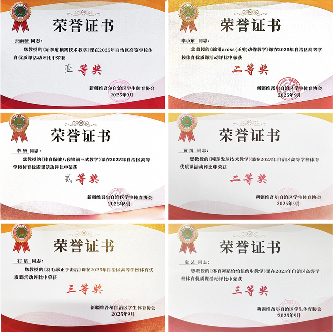 近日,2025年自治区普通高等学校体育优质课现场展示活动落幕。我校体育教学部6名教师取得突出成绩:公共体育高级职称组李妍、李小东获二等奖,石韬获三等奖;公共体育中级职称组张雨薇获一等奖,黄博获二等奖,袁艺获三等奖。