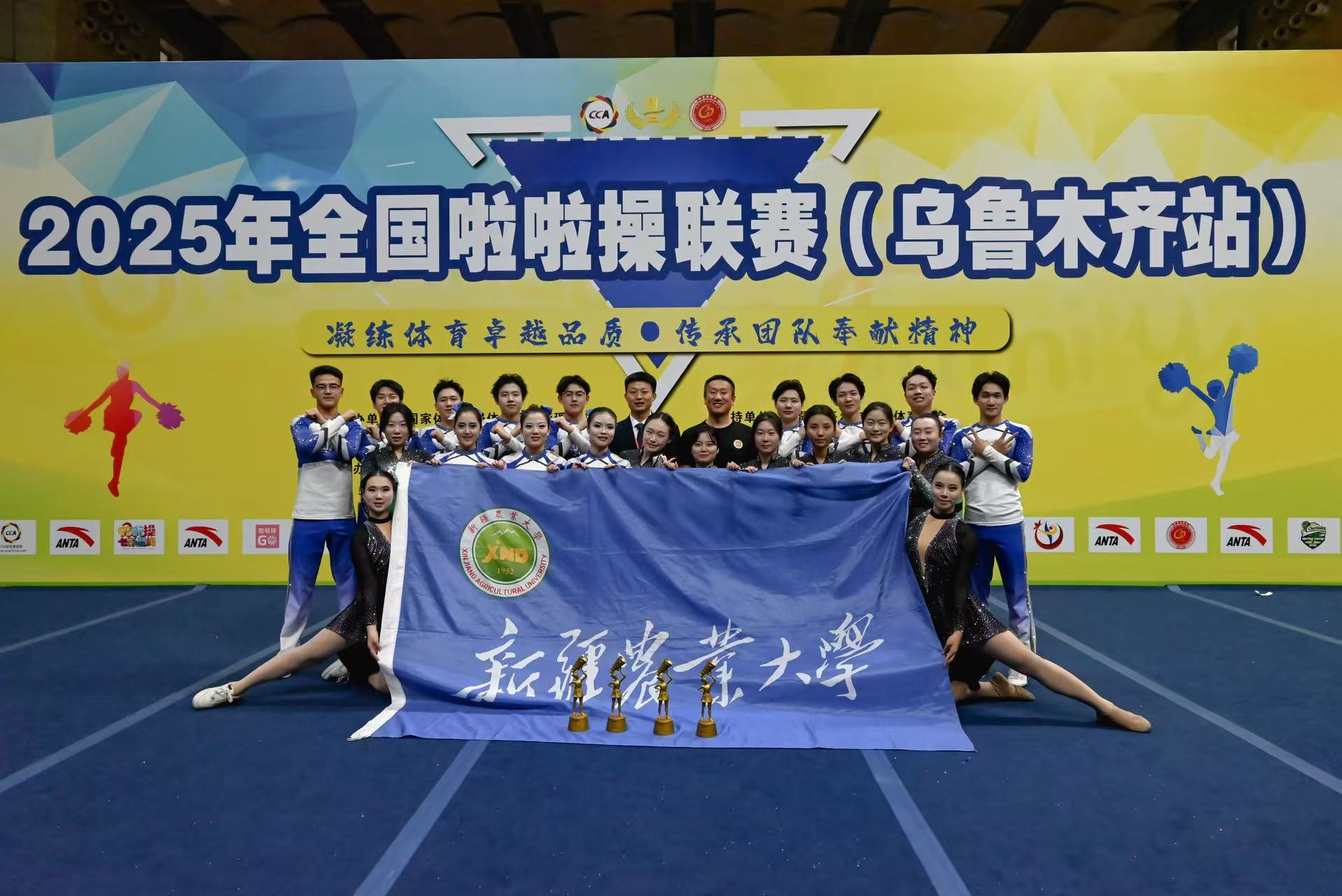 10月31日-11月2日,2025年全国啦啦操联赛(乌鲁木齐站)在新疆师范大学(昆仑校区)开赛,来自全国各地的68支代表队、1691名运动员同台竞技,展现青春风采与团队力量。经过激烈角逐,我校星梦啦啦操队脱颖而出,荣获青年乙组4个项目的冠军。