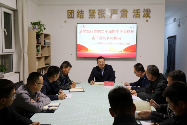 在库木奥依拉村,郑文新主持召开学习贯彻党的二十届四中全会精神座谈交流会,领学全会精神,与各驻村第一书记、副队长开展研讨交流。与会人员结合履职和工作实际逐一发言。郑文新对驻村工作队的工作给予了充分肯定,他强调,驻村工作队要把学习好、贯彻好党的二十届四中全会精神作为重大政治任务,同学习贯彻习近平总书记关于“三农”工作的重要论述和重要指示精神结合起来,充分发挥学校科技、人才、资源优势,在产业提质、民生改善、基层治理等方面精准发力,积极服务地方发展战略,努力为推进驻地农业农村现代化建设作出贡献。