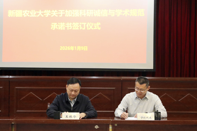 会议举行《新疆农业大学科研诚信与学术规范承诺书》现场签订仪式。校党委常委、副校长王振华代表学校依次与动物医学学院、农学院、林学与风景园林学院代表负责人郑重签署承诺书。
