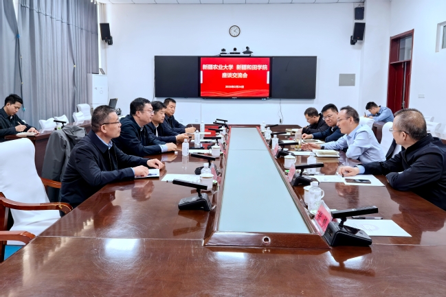 调研期间,郑文新一行前往和田学院开展座谈交流,对接两校合作事宜。和田学院党委副书记、院长王志坚详细介绍了学校办学定位、学科布局、涉农专业发展及服务地方农业产业的工作情况,希望两校进一步深化协作,在人才联合培养、科研平台共建、师资交流互鉴等方面实现协同发展。郑文新表示,和田学院在服务区域农业发展、培育基层农业人才方面有着不可替代的作用,新疆农业大学将以此次交流为契机,发挥自身学科、人才和科研优势,与和田学院深化务实协作,携手助力和田农业人才培养提质、产业技术升级,共同为地方农业农村现代化建设赋能。双方就具体合作事项达成初步共识,明确了后续对接推进机制。
