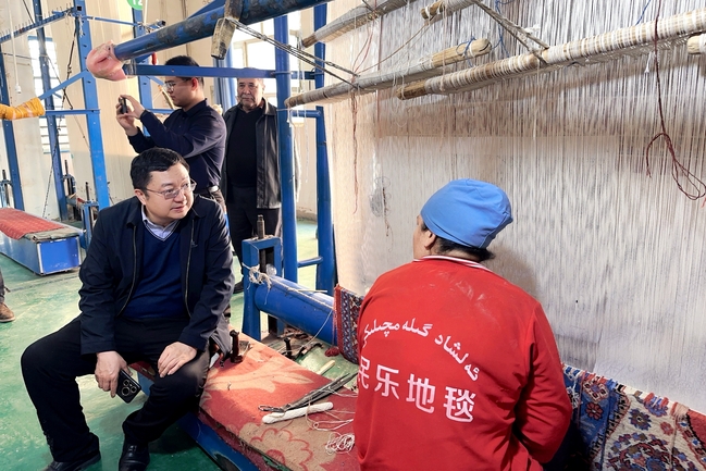 在洛浦县民乐地毯进出口有限公司,调研组详细查看手工羊毛地毯的织造工艺、产品品质及品种样式,详细了解手工地毯产业发展现状及在生产技术、品牌建设等方面的需求。