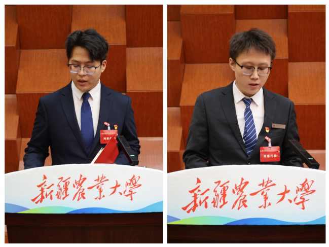 新疆农业大学第三十六届学生会主席团成员刘嘉鑫同学代表第三十六届学生会组织执行机构向大会作主题为《坚守红色初心 勇担兴疆使命 团结引领广大农大学子扎根边疆实践 为中国式现代化新疆篇章贡献农大力量》的工作报告;新疆农业大学第二十九届研究生会主席团成员徐贺同学代表第二十九届研究生会组织执行机构向大会作主题为《薪火相传担使命 砥砺奋进谱新篇》的工作报告。