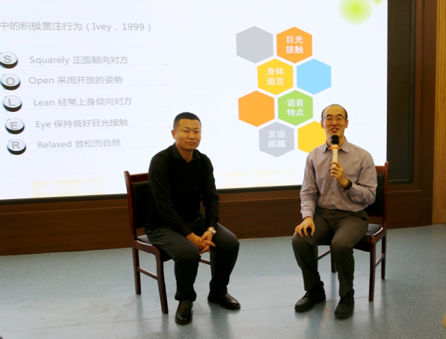 12月1日,薛艺重点以“具体应用—应用场景模拟”展开培训与交流。分别以心理危机类问题、情绪类问题、生涯适应与发展类问题为例。辅导员老师参与互动,进行场景模拟,体验沟通技术在谈心谈话过程中的应用。