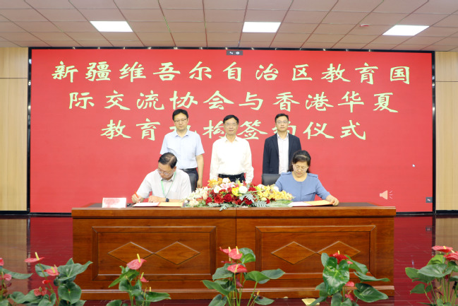 在蒋平安、颜为之和孙启胜的共同见证下,新疆维吾尔自治区教育国际交流协会会长马咏梅与香港华夏教育机构副会长招祥麒签订了教育交流合作协议,新疆农业大学附属中学党委书记荣群与香港香岛中学校长黄颂良、乌鲁木齐八一中学党委副书记、校长鲍永生与香港创知中学校长黄晶榕分别签订姊妹学校合作协议书。仪式中,香港华夏教育机构与新疆维吾尔自治区教育厅及各签约机构互赠纪念品庆祝签约成功。