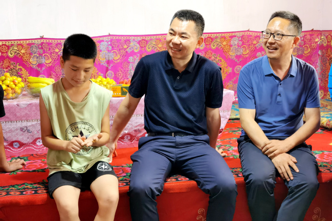 在托万克库木艾日克村,张硕看望了他的“民族团结一家亲”结对亲戚阿布都尼亚孜·亚森一家,亲切地与他们唠家常、了解家庭生活变化,并鼓励他们要靠双手勤劳致富,感恩党和政府的好政策。