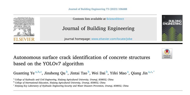 近日,新疆农业大学国际教育学院土木工程202班叶冠廷、曲金生、代维,土木工程204班陶金泰,水利与土木工程学院土木工程2102班毛逸飞5名本科学生在SCI期刊《Journal of Building Engineering》(JCR一区,中科院二区)上发表题为“Autonomous surface crack identification of concrete structures based on the YOLOv7 algorithm”的论文,通讯作者为水利与土木工程学院副教授晋强。