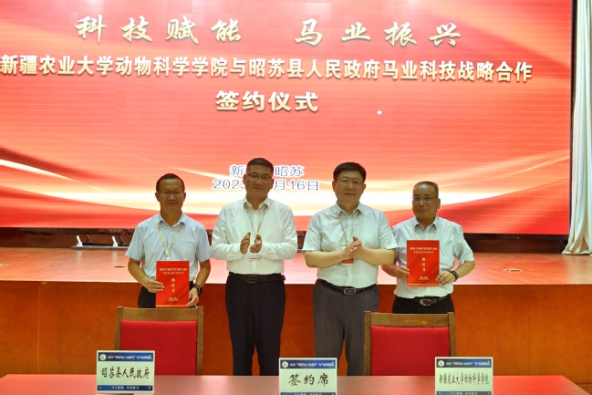 7月16日,谢树青与昭苏县委书记侯陶共同见证了新疆农业大学动物科学学院与昭苏县人民政府马业科技战略合作签约仪式。今后,双方将充分利用优势资源开展战略合作,通过深化产学研基地、科技小院等科技平台建设,在人才培养上进一步联动,在科技创新上进一步联手,在产业合作领域上进一步联创,积极发挥学校服务农业生产领域的积极作用,为昭苏县马产业高质量发展赋能。