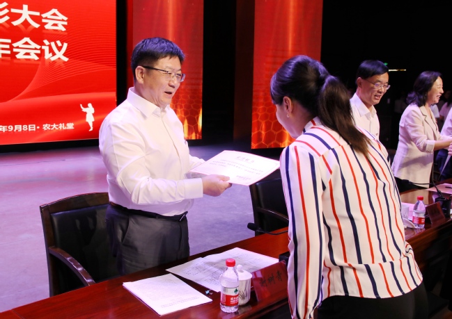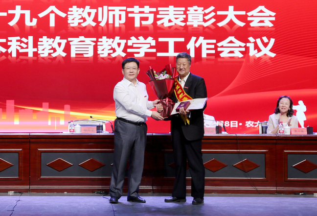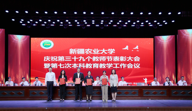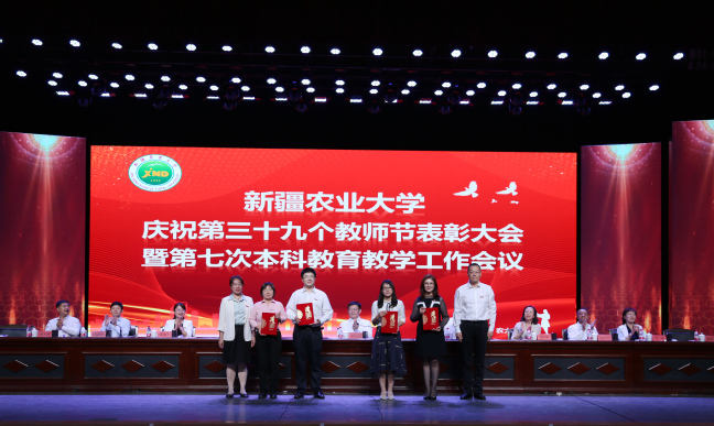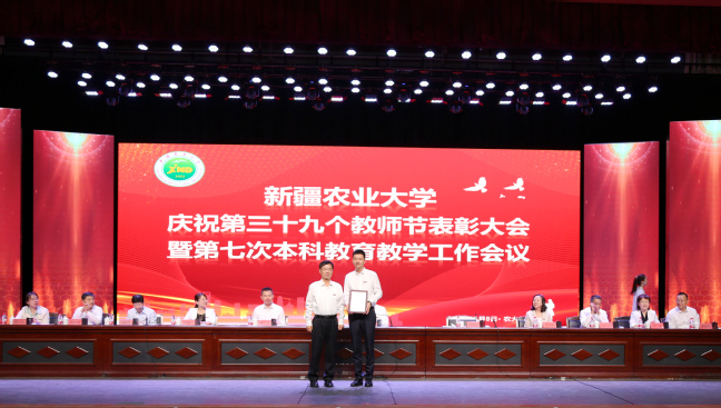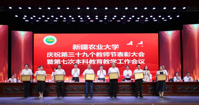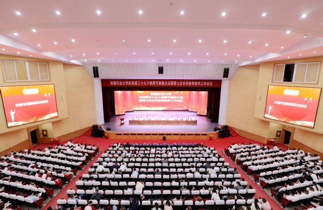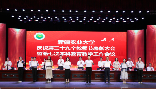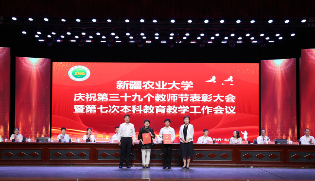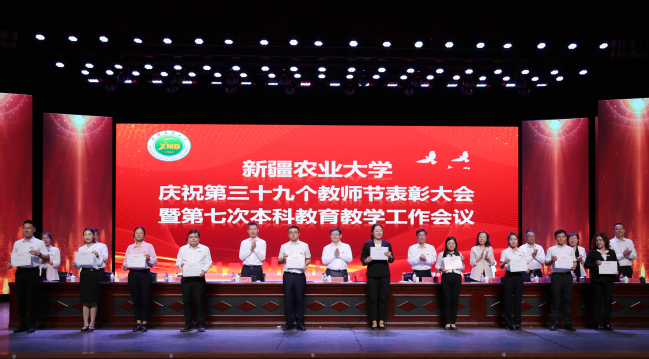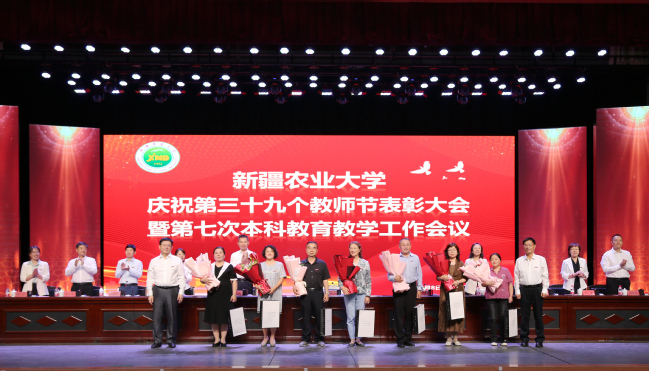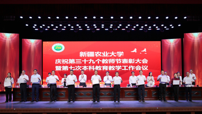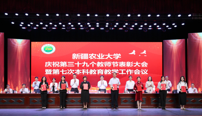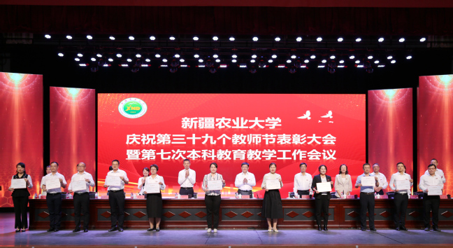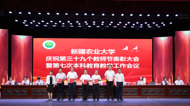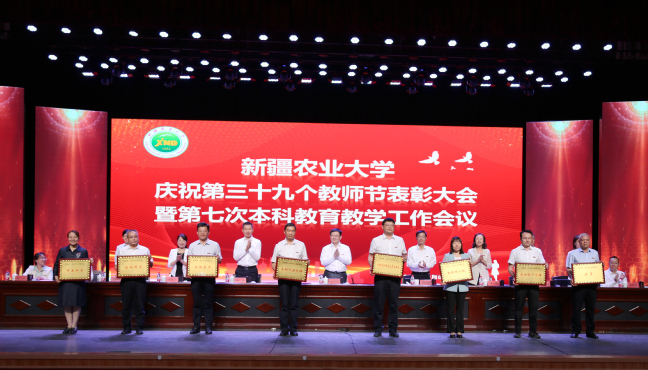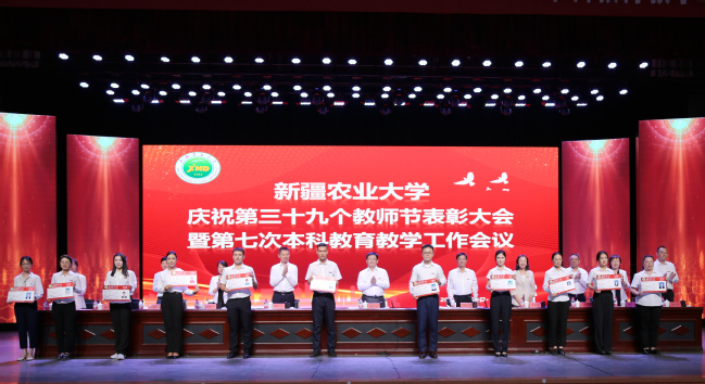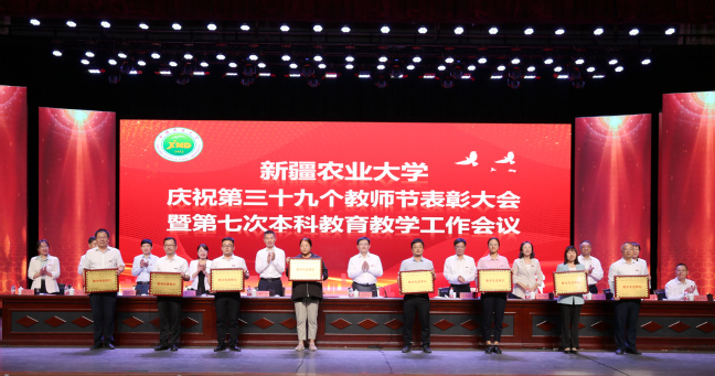 9月8日是新疆农业大学71周年校庆日,校园花团锦簇,会堂气氛热烈。学校“躬耕教坛 强国有我”庆祝第三十九个教师节表彰大会暨第七次本科教育教学工作会议召开。校党委书记谢树青、校长蒋平安与全体校党委常委、校领导、教学督导、获奖教师代表、2023年荣休教师代表、新入职教师代表以及师生代表们欢聚一堂、共庆节日。校党委常委、副校长綦群高主持大会。