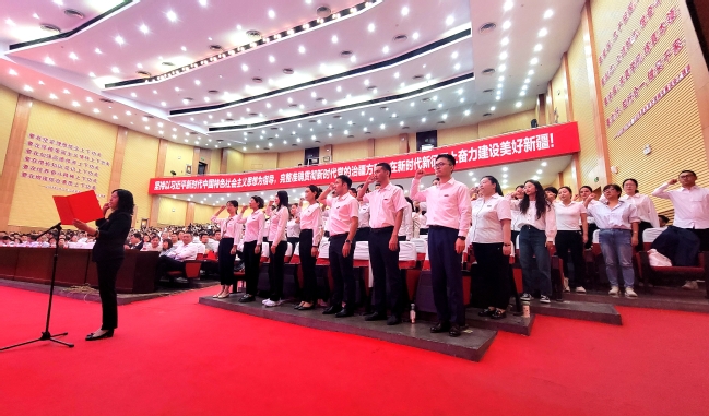“我是一名光荣的人民教师,我庄重宣誓……”农学院教授马德英带领104名新进教师作入职宣誓,郑重承诺履行教师职责,忠诚党的教育事业。