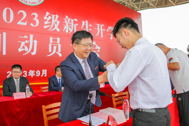 典礼上,全体在家校领导为新生代表赠书、佩戴校徽。当农大校徽别在胸前,从此与农大红色基因血脉相连,“自力更生、艰苦奋斗、求真务实、开拓进取”的农大精神将赓续传承,汇聚成建设社会主义现代化强国的磅礴力量。