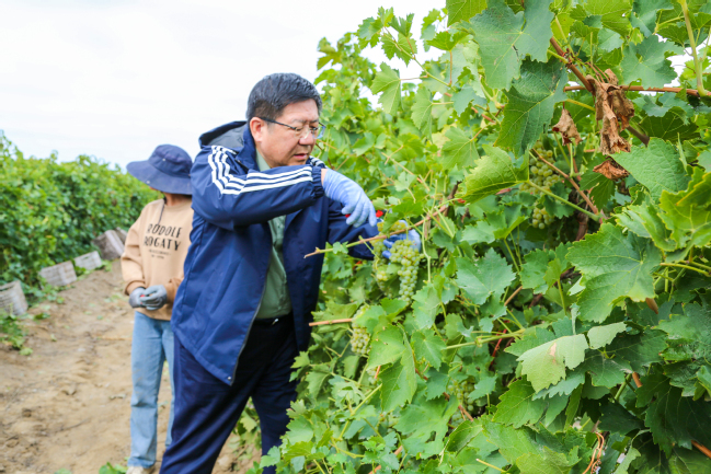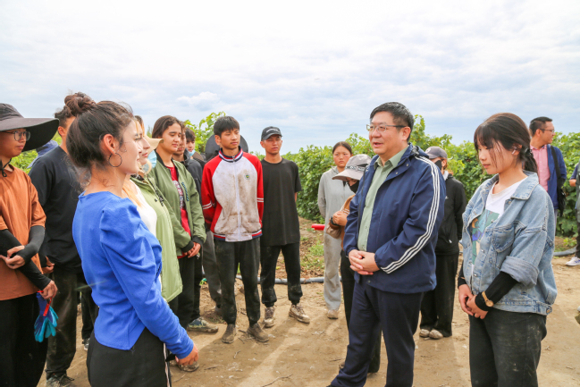 说话间,谢树青从地头顺手拿起手套和剪刀,走进田间,与同学们一道采摘葡萄。见到学校党委书记来看望大家,同学们纷纷上前来分享劳动实践心得。