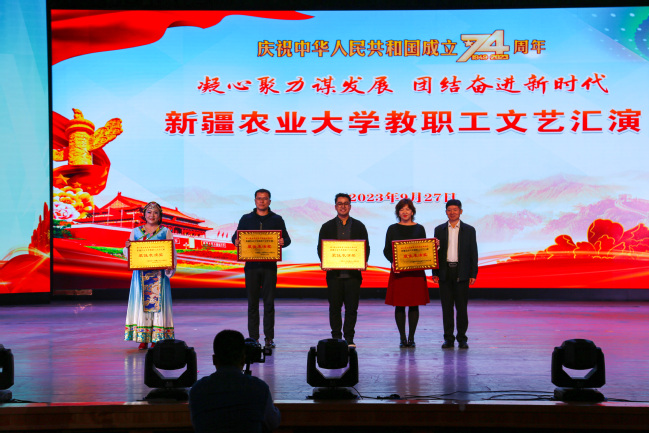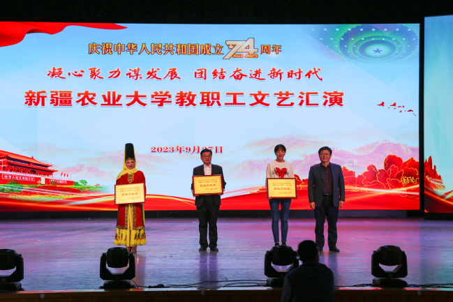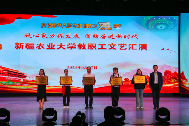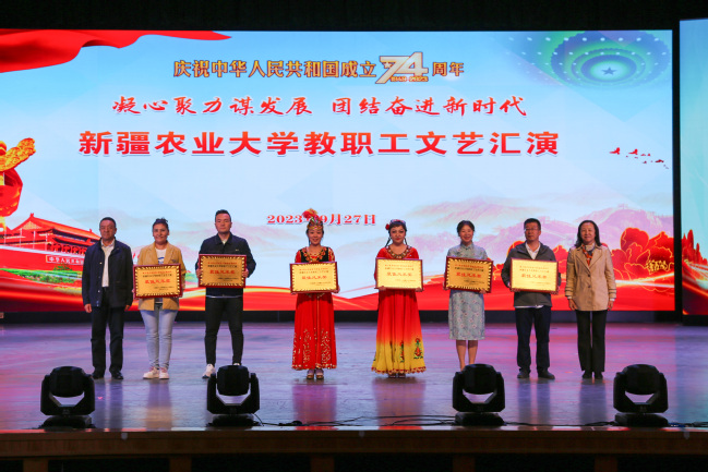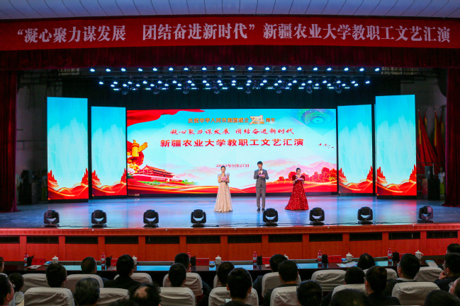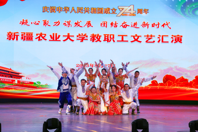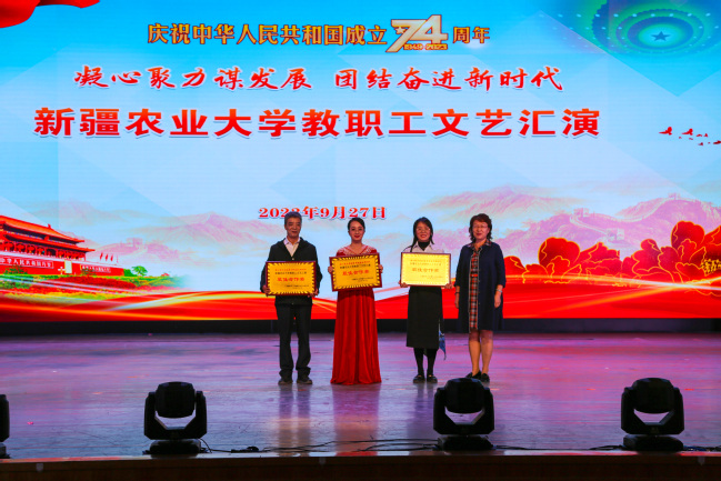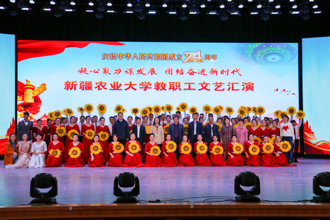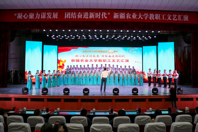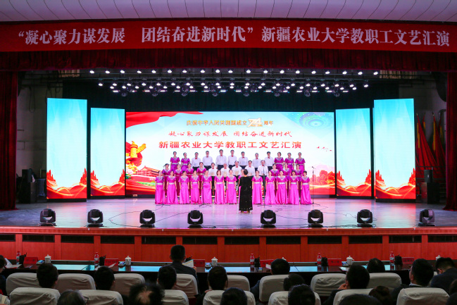 为庆祝中华人民共和国成立74周年,展示农大教职工昂扬向上、意气风发的精神风貌,9月27日下午,新疆农业大学教职工文艺汇演精彩上演。校党委书记谢树青带领全体在家校领导出席活动,与全体师生欢聚一堂,用最嘹亮的歌声深情告白伟大祖国,用最优美的舞姿赞颂新时代,用最深情的朗诵抒发农大人对美好未来的憧憬和期待。
