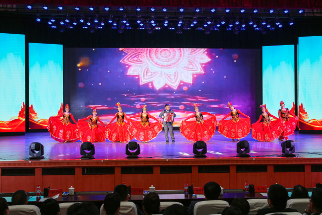 团结欢快的手鼓拍起来,热情活泼的麦西莱甫跳起来,离退休职工服务处演绎舞蹈《刀郎麦西莱甫》。