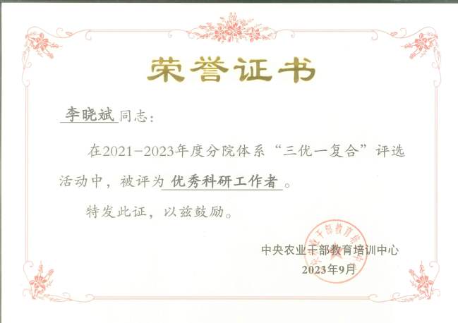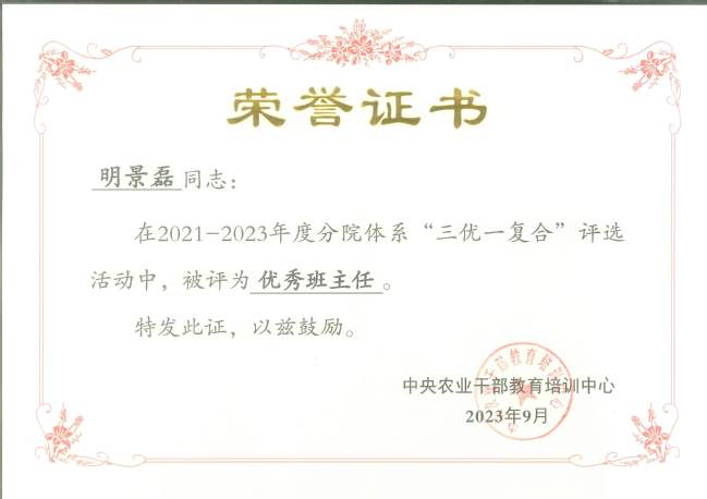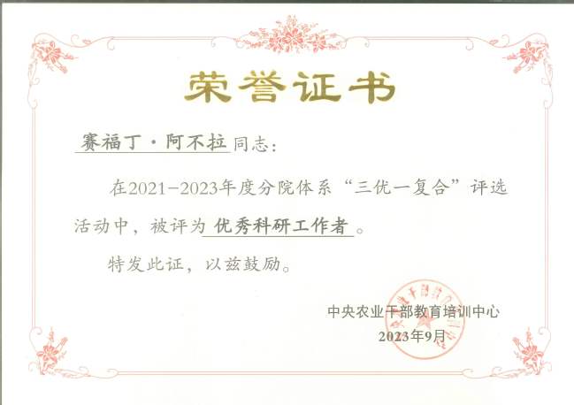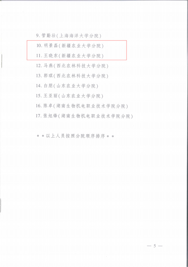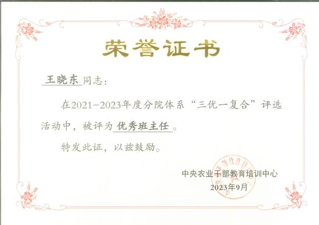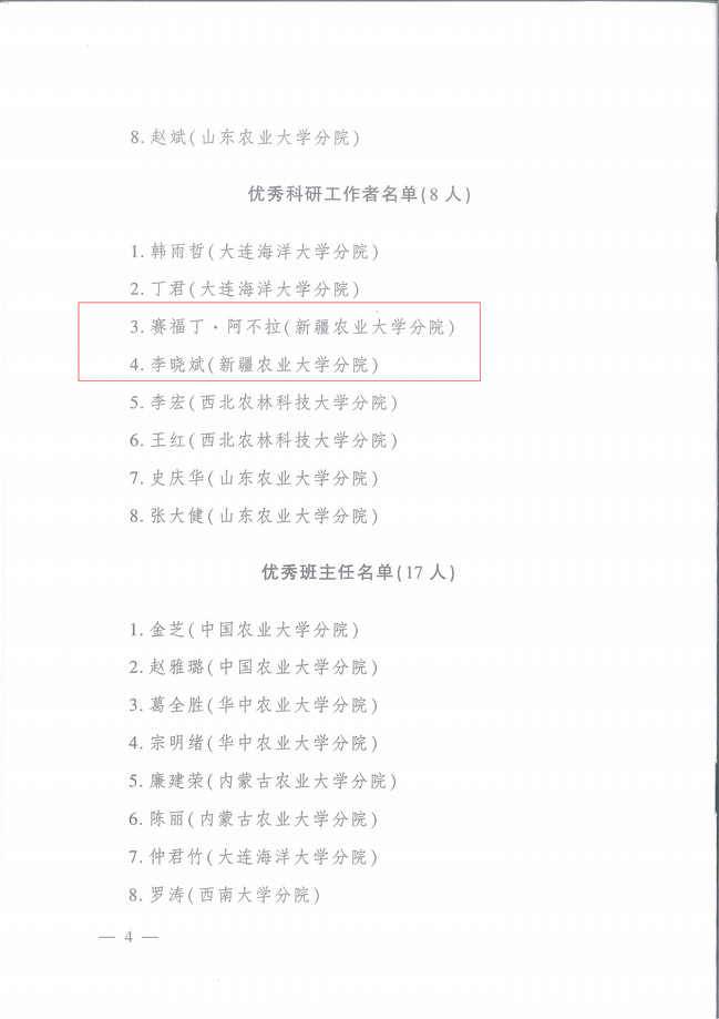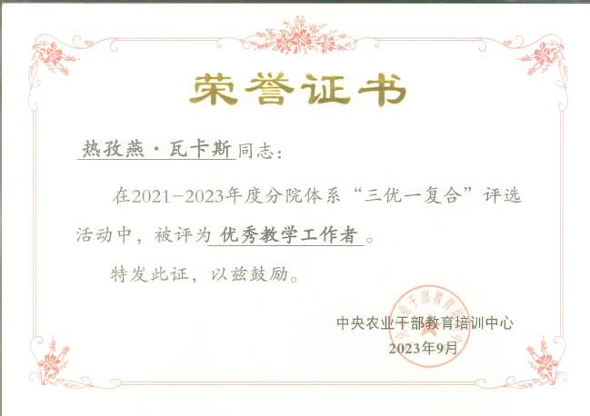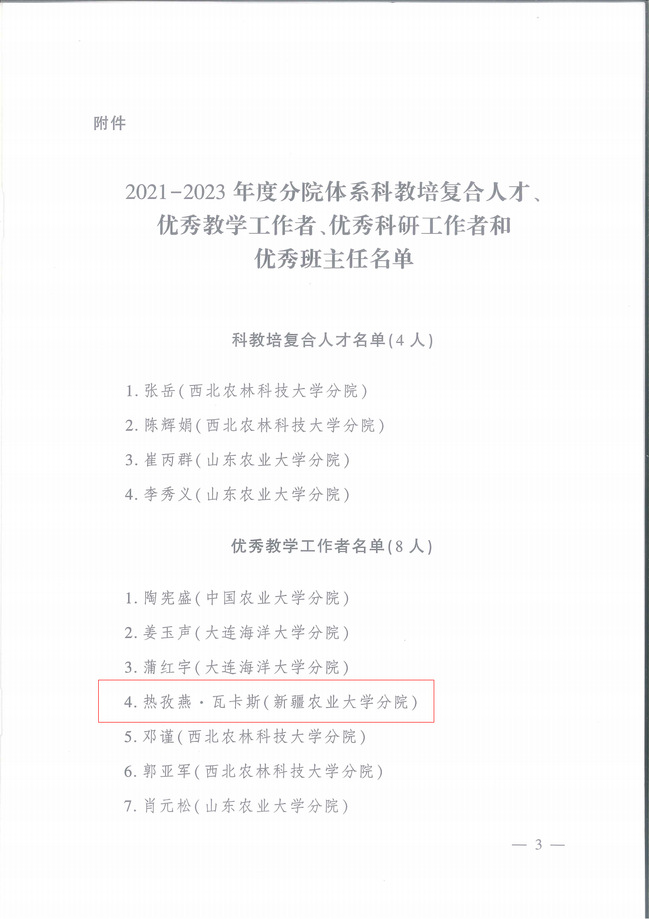 9月5日,中央农业干部教育培训中心公布2021-2023年度分院体系科教培复合人才、优秀教学工作者、优秀科研工作者和优秀班主任名单。授予新疆农业大学分院热孜燕·瓦卡斯教授“优秀教学工作者”称号;赛福丁·阿不拉教授、李晓斌副教授“优秀科研工作者”称号;明景磊、王晓东“优秀班主任”称号。