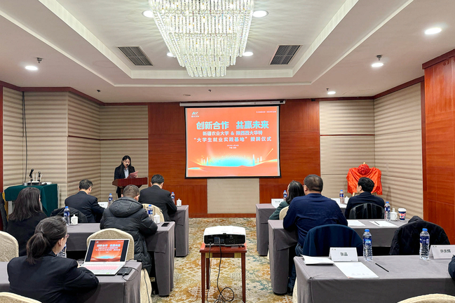11月24日,新疆农业大学与陕西西大华特科技实业有限公司举行校企合作交流暨大学生就业实践基地揭牌仪式。 新疆农业大学党委副书记张小楠,陕西西大华特科技实业有限公司董事长王鹏,援疆干部、新疆农业大学农学院副院长胡白石教授出席活动,共同为大学生就业实践基地揭牌。