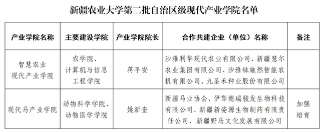 近日,自治区教育厅、自治区发展和改革委员会、自治区工业和信息化厅公布了第二批自治区级现代产业学院名单,我校“智慧农业现代产业学院”“现代马产业学院”榜上有名,加上首批“中信国安-新疆农业大学葡萄酒学院”,学校一共有3个自治区级现代产业学院。