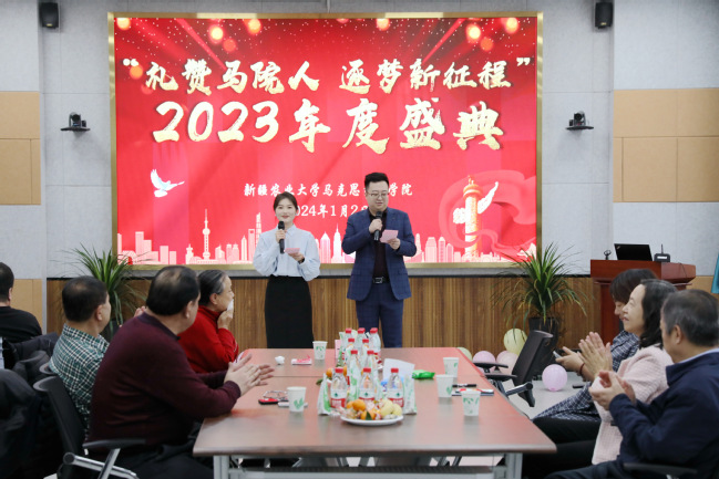 《魏书·乐志》言:“岁聿云暮,一元复始”。隆冬盈满,万物如诗之景致,舒展崭新画卷。1月2日下午,马克思主义学院“礼赞马院人 逐梦新征程”年终盛典活动在研究生院三楼报告厅举行。校党委副书记、马克思主义学院院长张小楠,研究生院常务副院长石书兵,学工部部长、学生处处长吴星霖,教务处处长林丽,科技处处长颜安,学工部副部长、校团委书记郝鹏,宣传部副部长赵晓露,人事处副处长叶小丽,马克思主义学院全体教师参加此次活动。