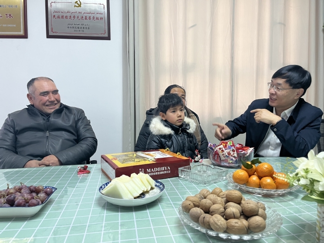调研期间,蒋平安看望慰问结对亲戚艾合麦提·艾尔肯一家,详细了解结对亲戚家庭生活、生产收入和子女就业状况,鼓励他们加强国家通用语言学习、积极参加技能培训,通过稳定就业创造更加美好的生活。