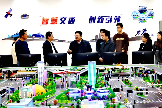 谢树青认真听取了学院党委副书记(主持党务工作)杨勇对学院近期改革发展工作情况的汇报,了解了学院党建文化阵地建设、教学科研团队发展等情况,深入调研了学院心理咨询室、智慧交通综合实验室、智能交通工程研究中心。在智慧交通综合实验室,谢树青认真听取实验中心主任吐尔逊·买买提关于实验室的功能布局及建设运行情况的介绍。