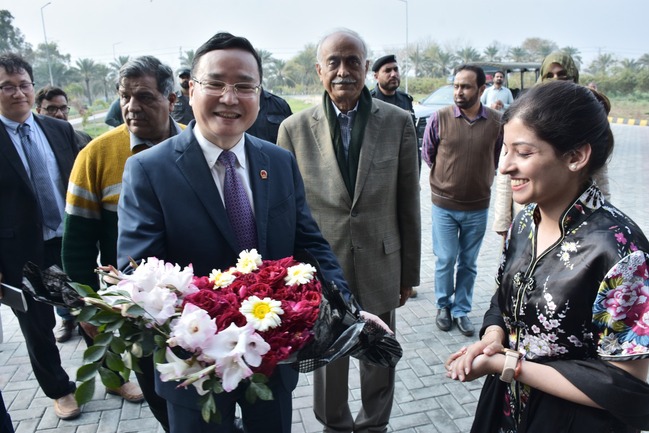 3月13日,中国驻巴基斯坦拉合尔总领事馆赵世人总领事一行走访我校巴基斯坦费萨拉巴德农业大学孔子学院(以下简称“费萨孔院”),巴方大学校长兼费萨孔院巴方理事长伊克拉·艾哈迈德·汉教授(Prof. Iqrar Ahmad Khan),孔院巴方院长扎希尔·艾哈迈德·扎希尔教授(Prof. Dr. Zahir Ahmad Zahir),巴方大学各学院院长、行政主管、曾在华留学的巴方教师、在巴方大学读书的中国留学生以及孔院师生等80多人参加活动。