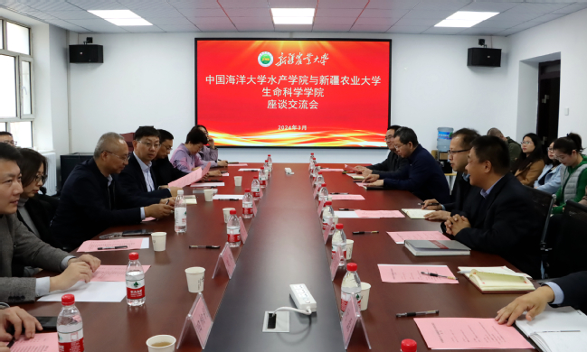 为进一步落实对口援疆工作会议精神,推动对口援疆工作高质量开展,3月25日,中国海洋大学发展规划处处长罗轶、水产学院党委书记张猛、国际教育学院院长吴慧、水产学院相关领导、专家教授一行8人,自治区农业农村厅渔业渔政管理局局长邓康处到新疆农业大学生命科学学院座谈交流。学校发展规划处处长王金泉、国际教育学院院长杨志江、生命科学学院党政领导班子以及水产养殖教研室相关教师参加座谈,座谈会由生命科学学院党委书记王希东主持。