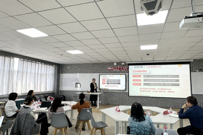 心理健康教育中心主任王盼盼围绕“大学生情绪管理与压力应对”作专题授课,主要从课程目标、学情分析、教学设计、教学内容及教学方法等方面进行阐述,运用任务驱动、案例教学、小组讨论等教学方法贯穿教学内容,确保混合式教学效果。授课教师就课程内容的调整、教学环节的设计以及如何增强课堂的知识性和体验性等方面,进行了激烈讨论。